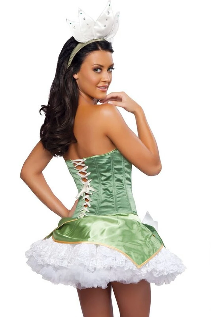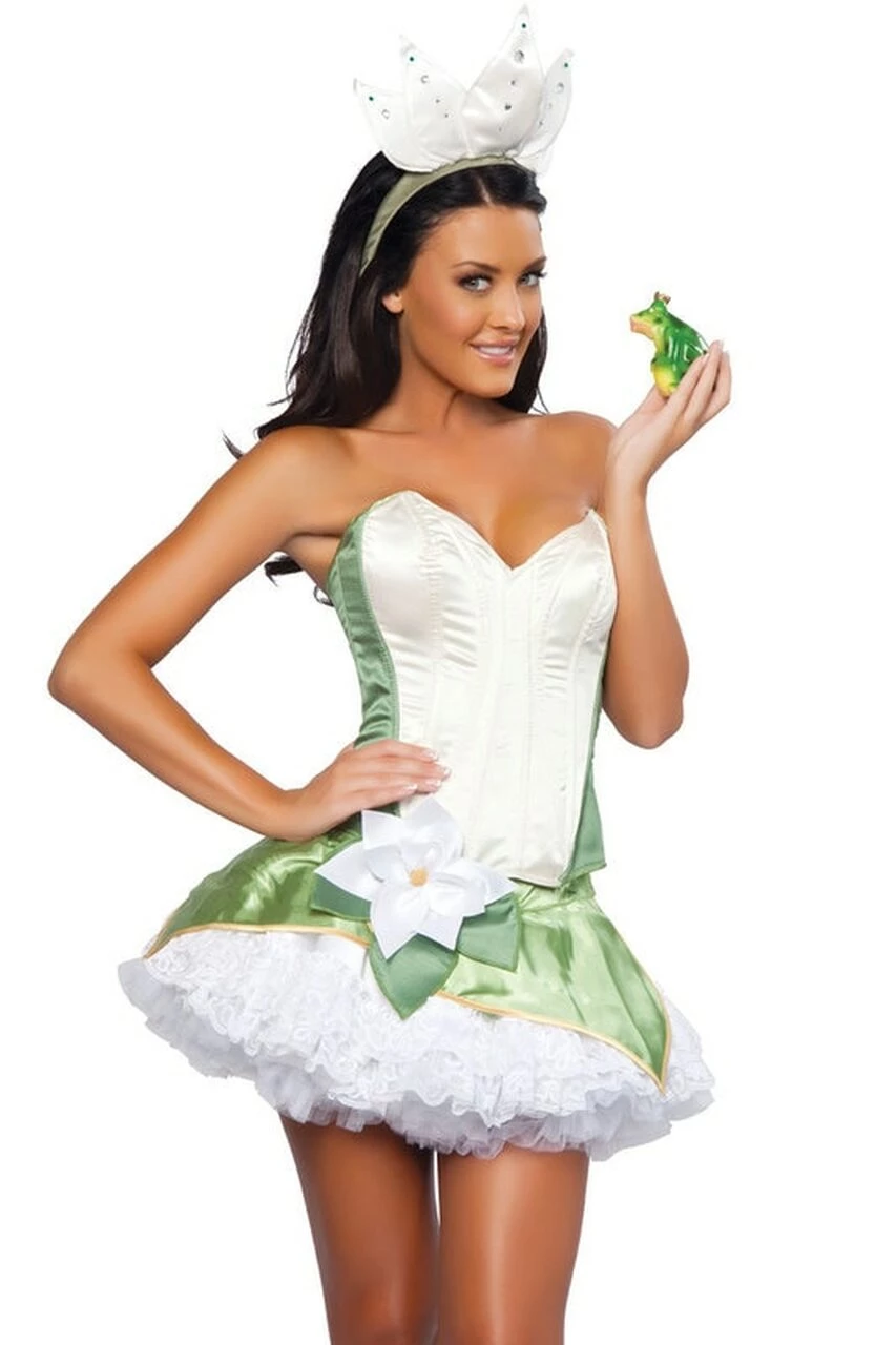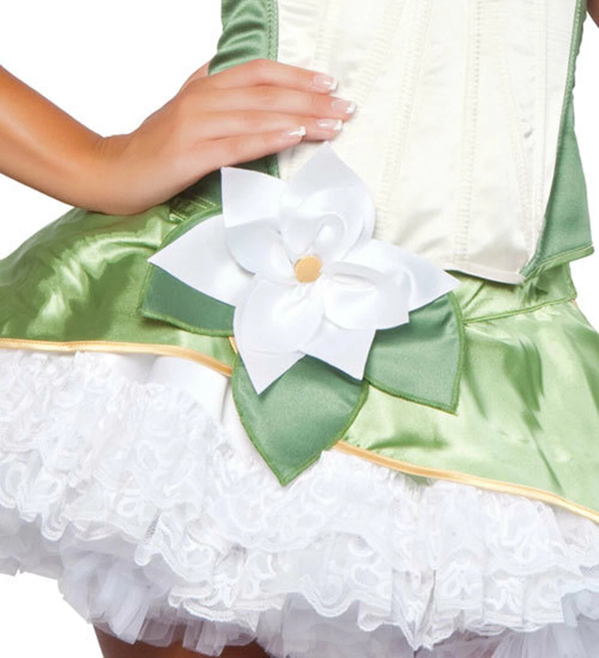 This is a sexy, cute play on the ‘ol how many frogs do you have to kiss to get your prince? In this costume, you’re the lily pad! The Magic Kiss Princess Costume is a four piece ensemble featuring a strapless white and green corset with lace-up back, a mini skirt with a double lace hem, a removable water lily pin and a white water lily rhinestone embellished head band. Two layer petticoat not included. Frog not included.