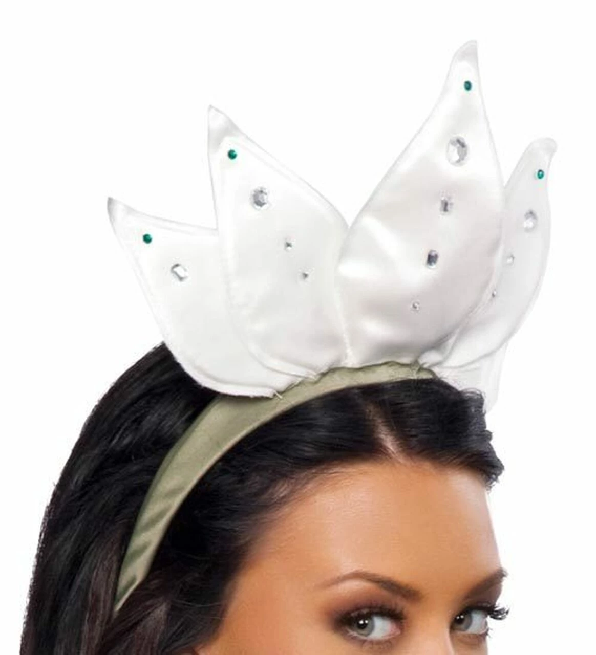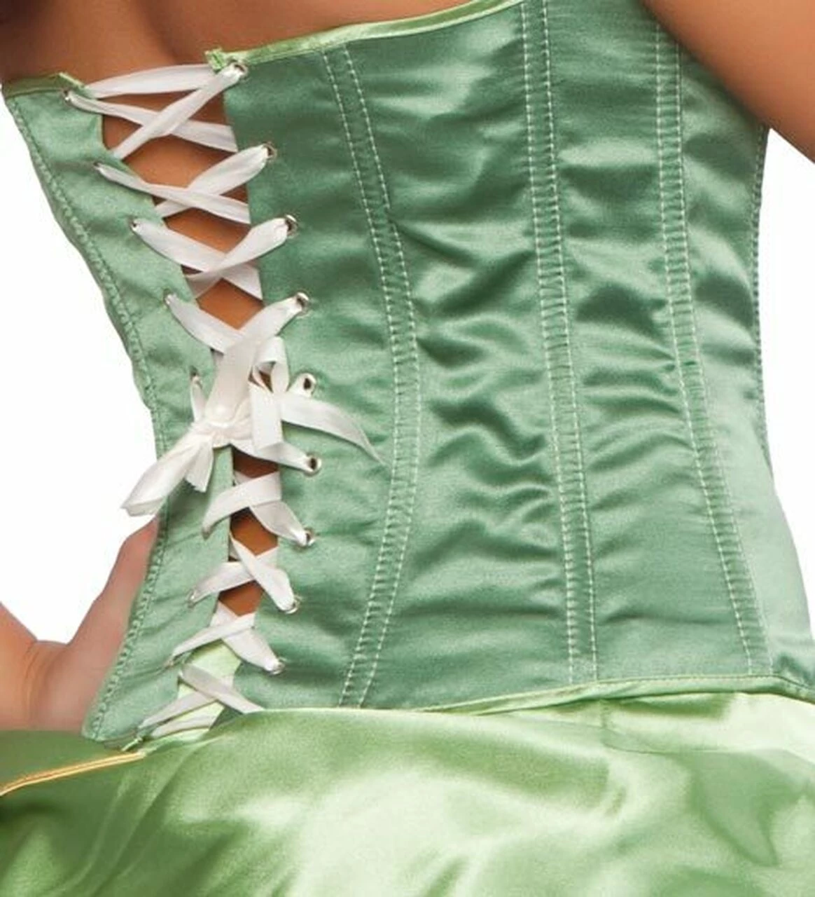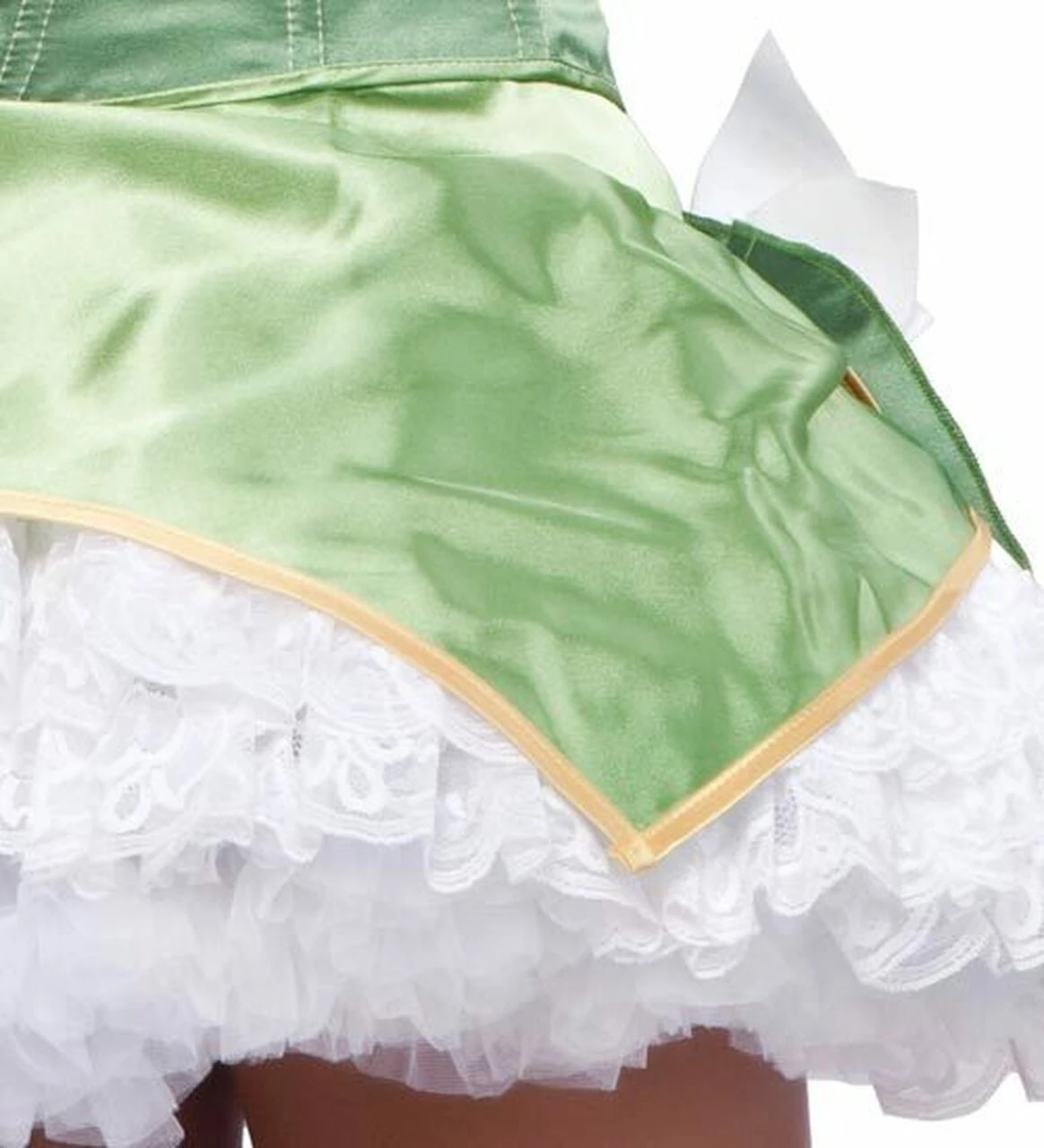 This is a sexy, cute play on the ‘ol how many frogs do you have to kiss to get your prince? In this costume, you’re the lily pad! The Magic Kiss Princess Costume is a four piece ensemble featuring a strapless white and green corset with lace-up back, a mini skirt with a double lace hem, a removable water lily pin and a white water lily rhinestone embellished head band. Two layer petticoat not included. Frog not included.