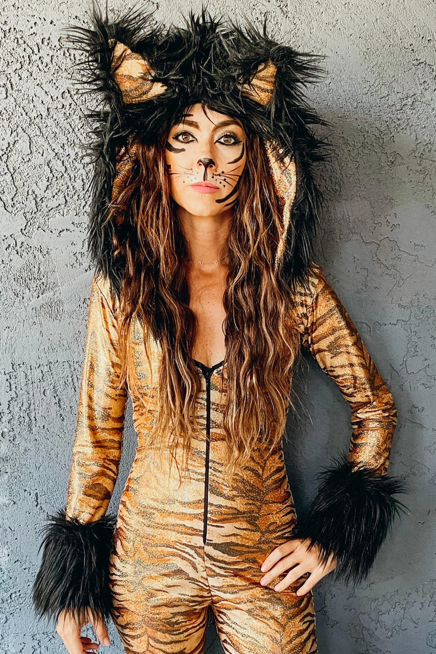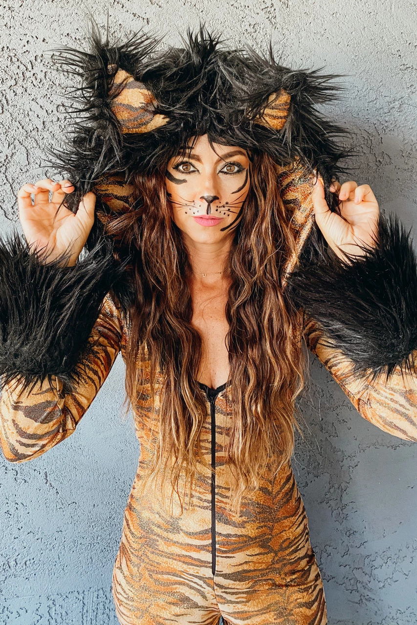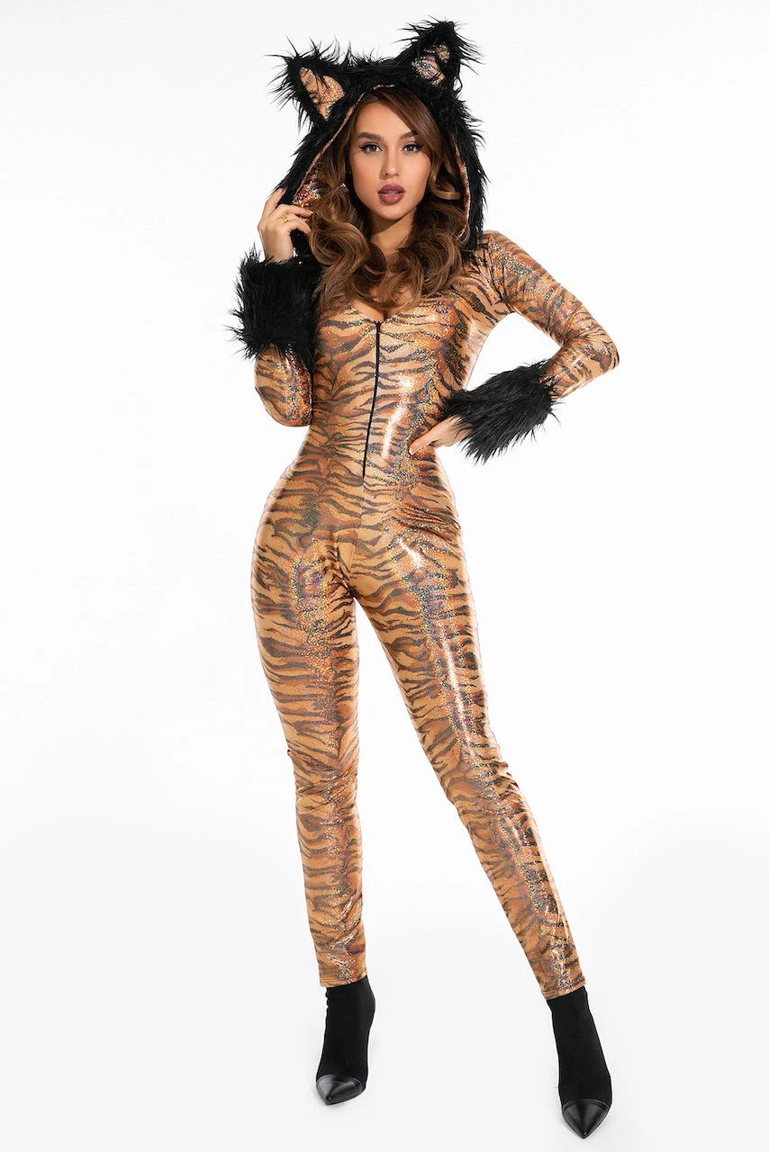 They’re gonna hear you roar in this Metallic Hooded Tiger Costume featuring a metallic, tiger printed catsuit with long sleeves, an attached hood with faux fur trim, an attached tail and a zip up front.