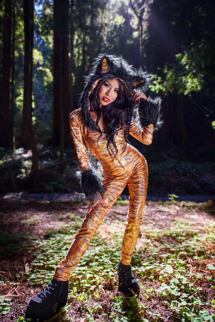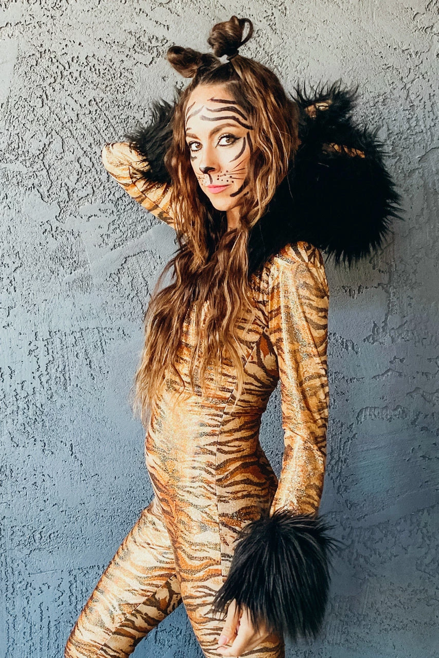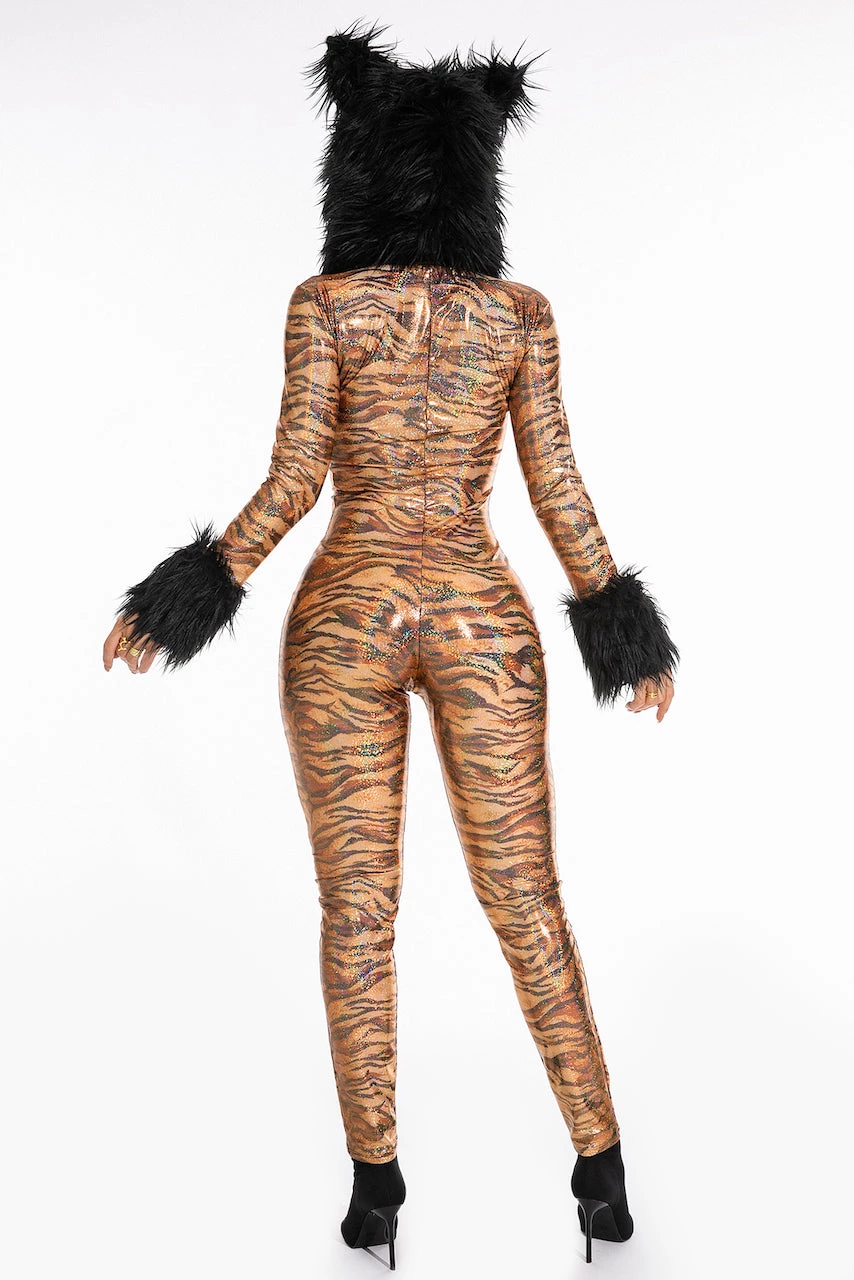 They’re gonna hear you roar in this Metallic Hooded Tiger Costume featuring a metallic, tiger printed catsuit with long sleeves, an attached hood with faux fur trim, an attached tail and a zip up front.