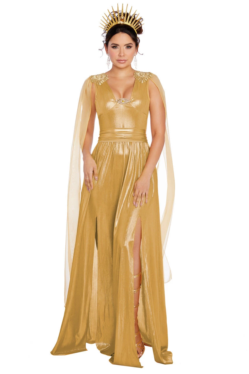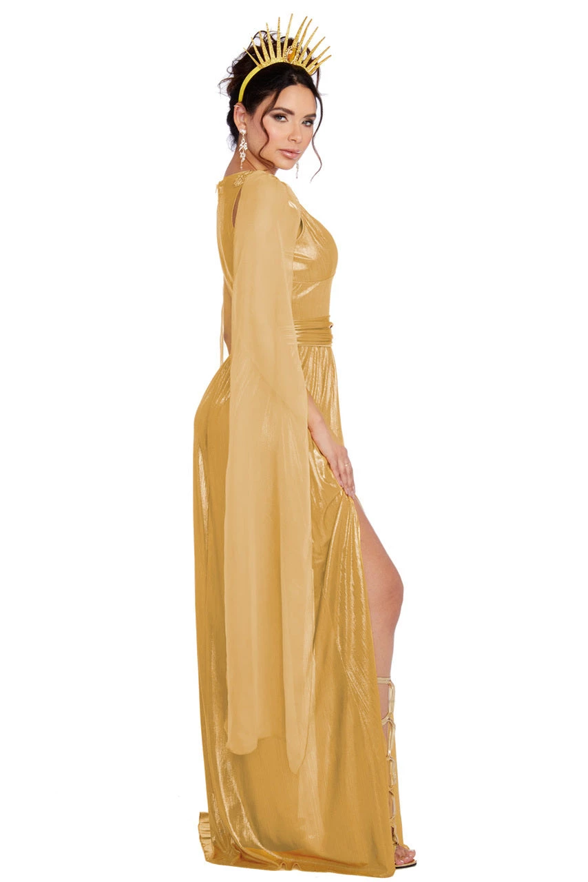 Shine like the sun in this Sun Goddess costume featuring a long gold dress with attached mesh sashes and high cut slits, a matching belt and an intricate headpiece.