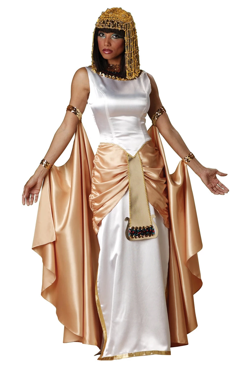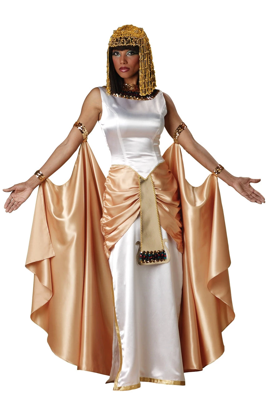 This Queen Cleo costume includes a full length satin gown with attached waist sash, gold apron drop, sequin collar, long cape and beaded headpiece.