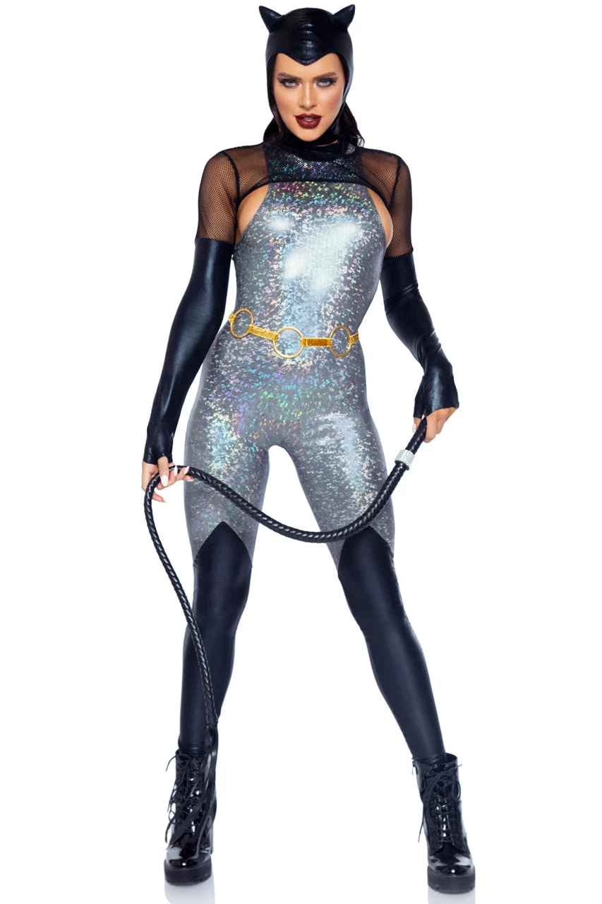 This four-piece, Feline Felon costume includes a holographic catsuit with a high cut neckline, boot detail, a black fishnet gloved shrug, cat ear skull cap, and belt. (Whip not included.)