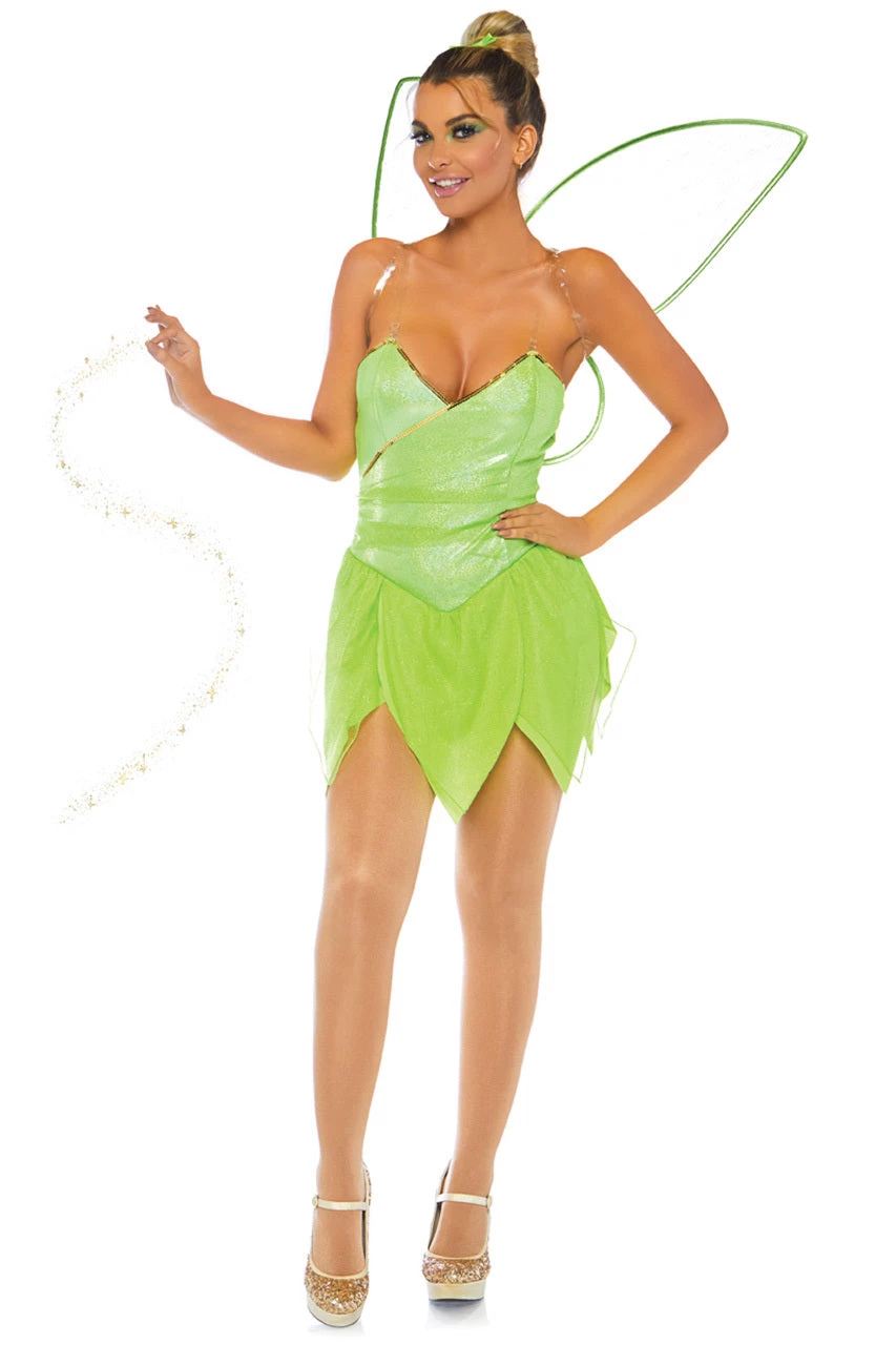 Take flight in this four-piece Pretty Pixie costume featuring a green shimmer bodysuit with a snap crotch closure, a glitter petal skirt, clear removable straps, fairy wings and a hair ribbon.