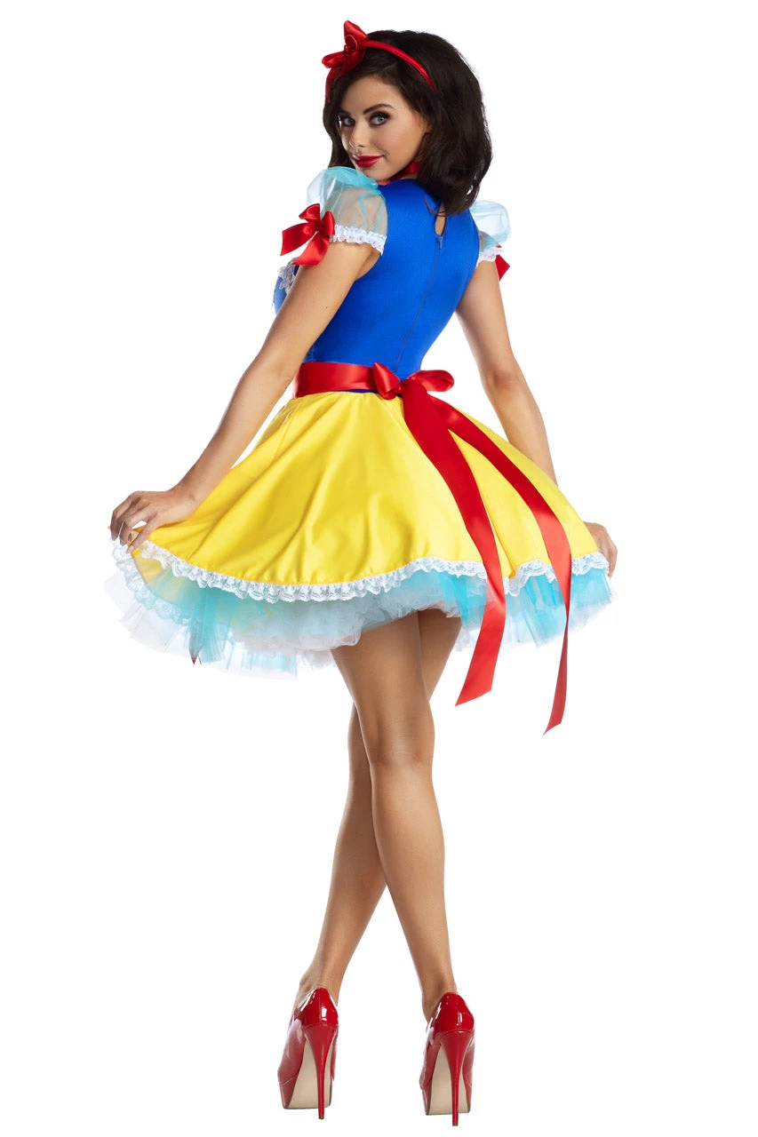 This Snow Apple Princess costume includes a blue and yellow dress with embroidery details, ribbon and bow appliques, puff sleeves, ribbon tie back, and a matching headpiece. (Petticoat not included.)