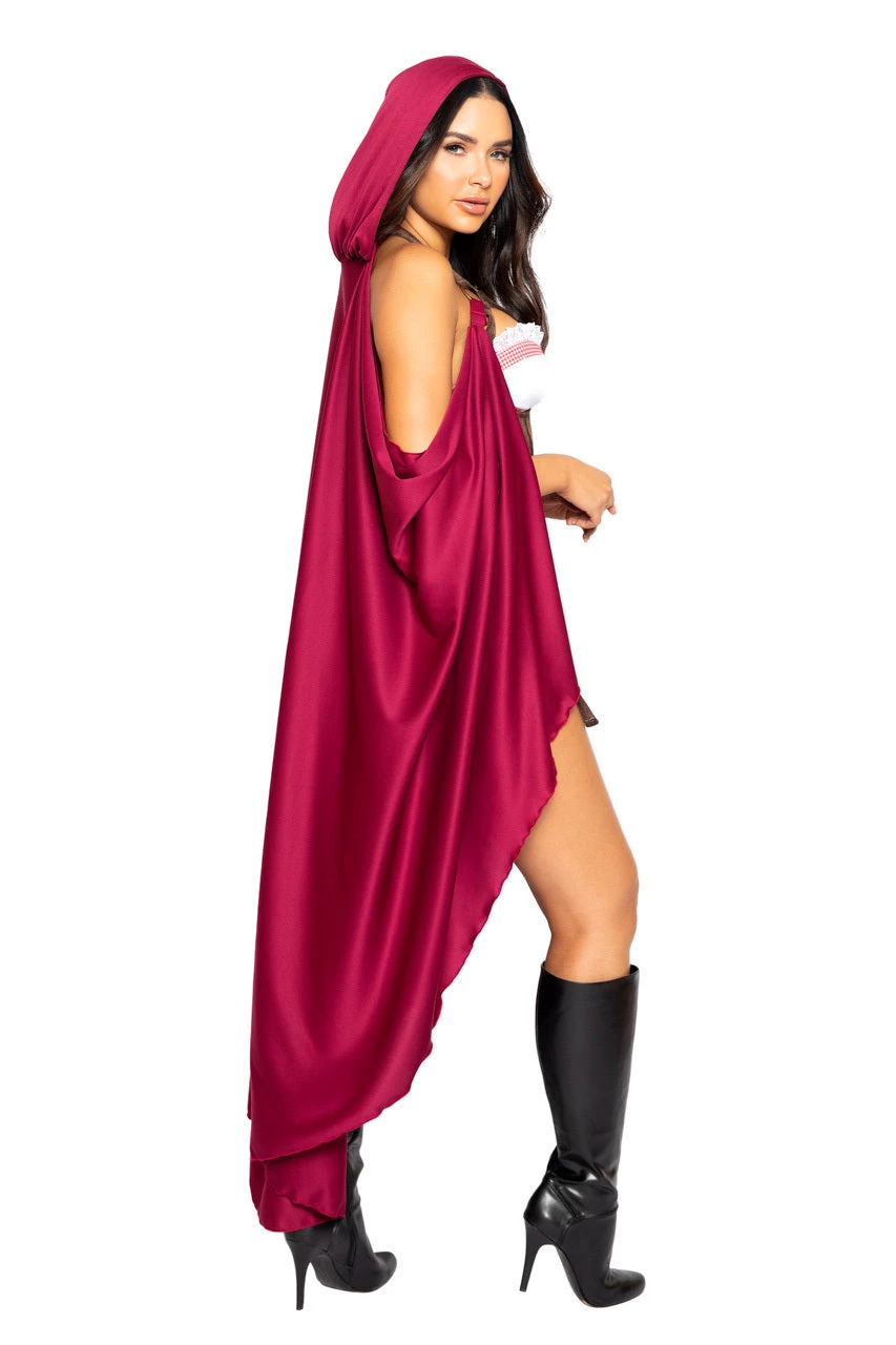This Deluxe Riding Hood costume includes a pink and white romper and a brown, faux suede harness with an attached red hooded cape.