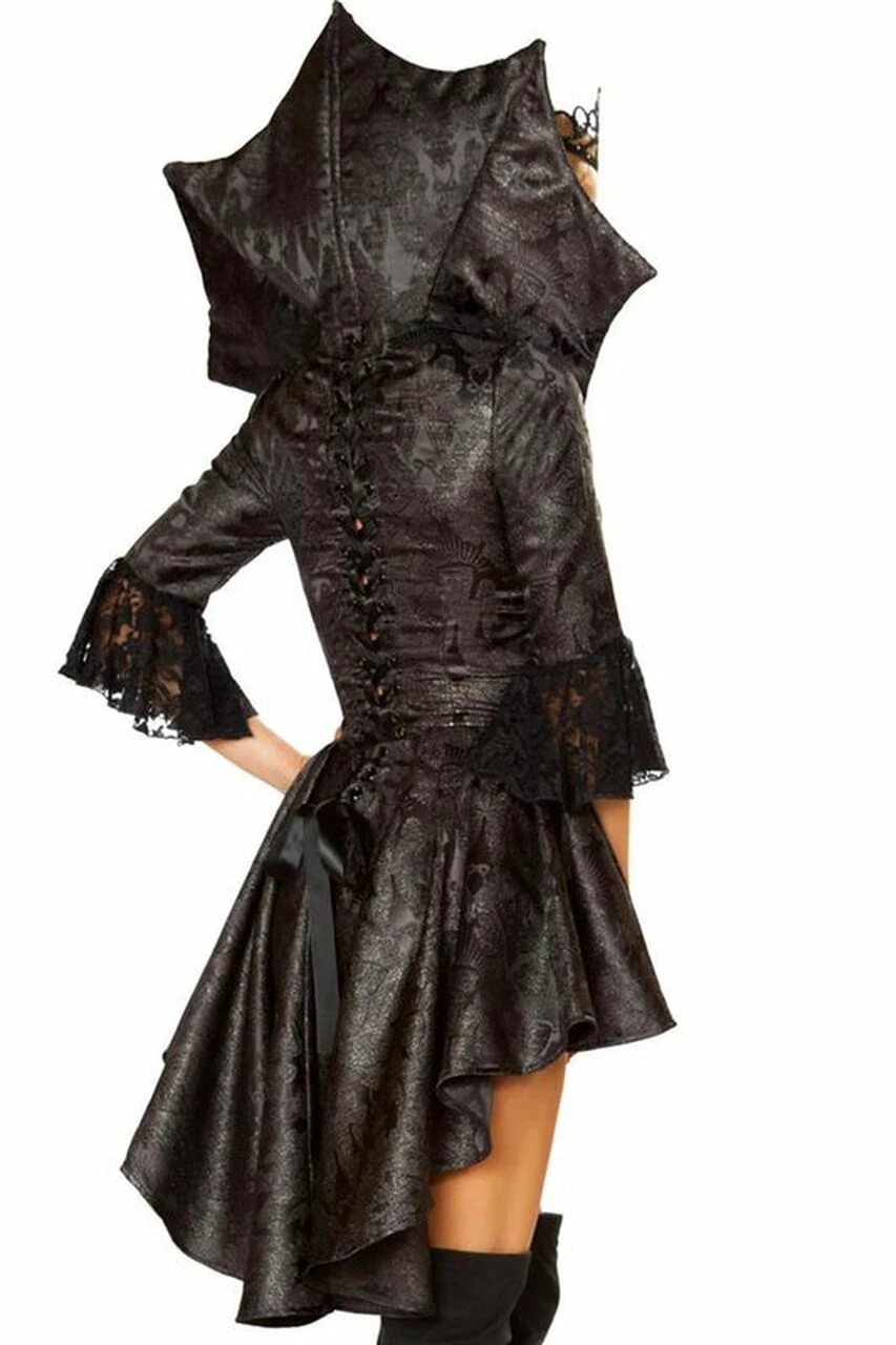 They’re sure to bow down to you in this four-piece Queen of Darkness costume featuring a dress with a built in corset, a high/low hemline, a structured bustline, mini shorts, a removable collar and a crown.