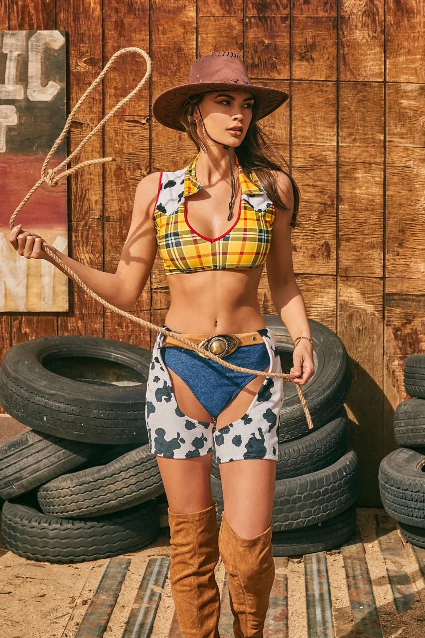 This three-piece, Sheriff Cutie costume includes a yellow plaid crop top with cow print detail, faux denim shorts, cow print chaps, and belt. (Hat not included.)